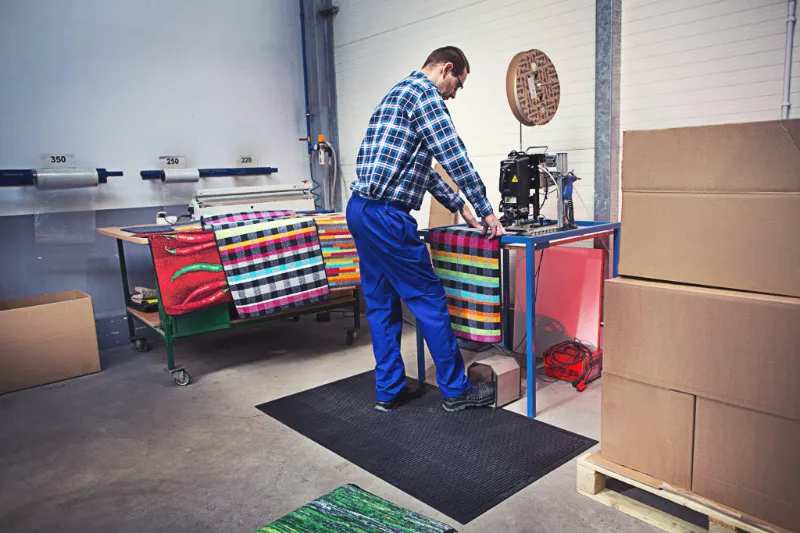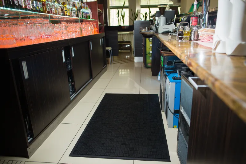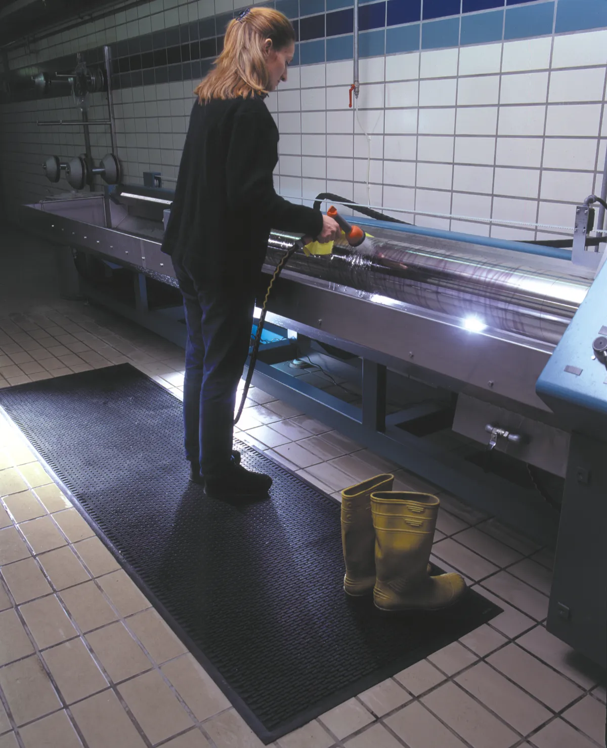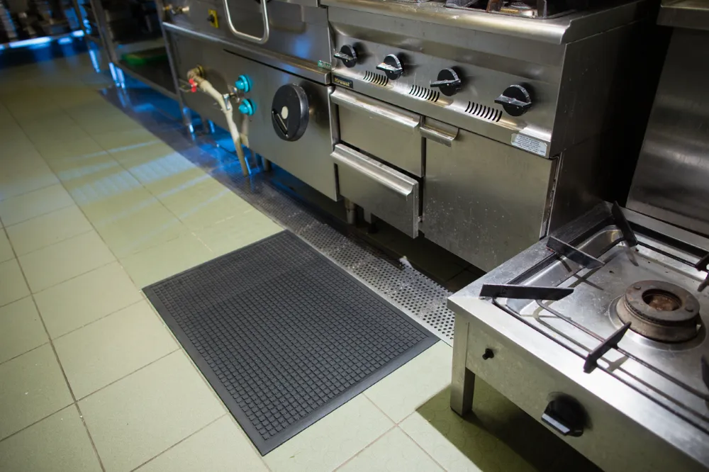 Tööline puhastamas survepesuga musta reljeefset Floorstudio kummimatti tööstuslikus köögis